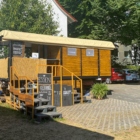 Nicht zu vergessen die Streetfood-Meile gegenüber dem Fridericianum am Friedrichsplatz. Eine reiche Auswahl an Speisen wird hier kredenzt: von Flammkuchen, Wraps, Bowls bis hin zu Linsenbratlingen und deftigen Fleichgerichten, teilweise auch in Bio-Qualität von regionalen Anbietern. Hier kann ich noch einmal aus der Entfernung auf Dan Perjovschis Säulenkunst am Fridericianum blicken und lasse meinen documenta-Tag voll der Eindrücke ausklingen.